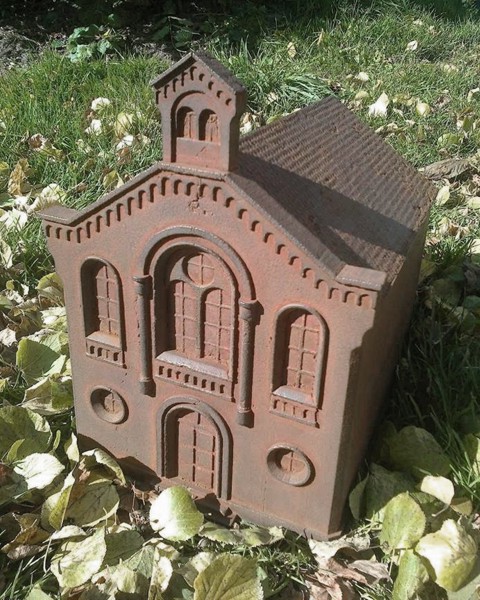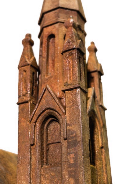 Modely z extrudovaného polystyrenu rozložené na jenotlivé díly (stěny, střechy, věže) jsou ve slévárně Aleše Svojitky zaformovány do písku a odlity z šedé litiny. Polystyren se při lití vypaří...