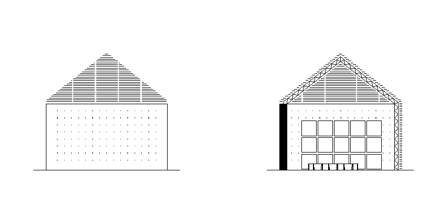 Základním prvkem nové stavby je masivní zeď – motiv tradiční až archaický, a proto nadčasový. Ostatní plášť budovy je lehký, tvořený na povrchu žaluziemi ovládajícími denní světlo. Takto kontrolované prostředí vytváří podmínky pro galerijní funkci. Vnější žaluzie jsou z měděného plechu. Vnitřní z opakního skla umožňují otevření (průhlednost) nebo uzavřenost - mléčnou čistotu. Otvory ve zdi po sponách bednění spolu s použitím běžného lešení jsou jednoduchými prostředky pro jakoukoli instalaci (inspirováno otvory po lešení ve středověkém zdivu). Zázemí (WC, café) je tvořeno samostatnými "krabicemi" s možností obměny nebo přeskupení (k ilustraci: přepravní kontejnery).